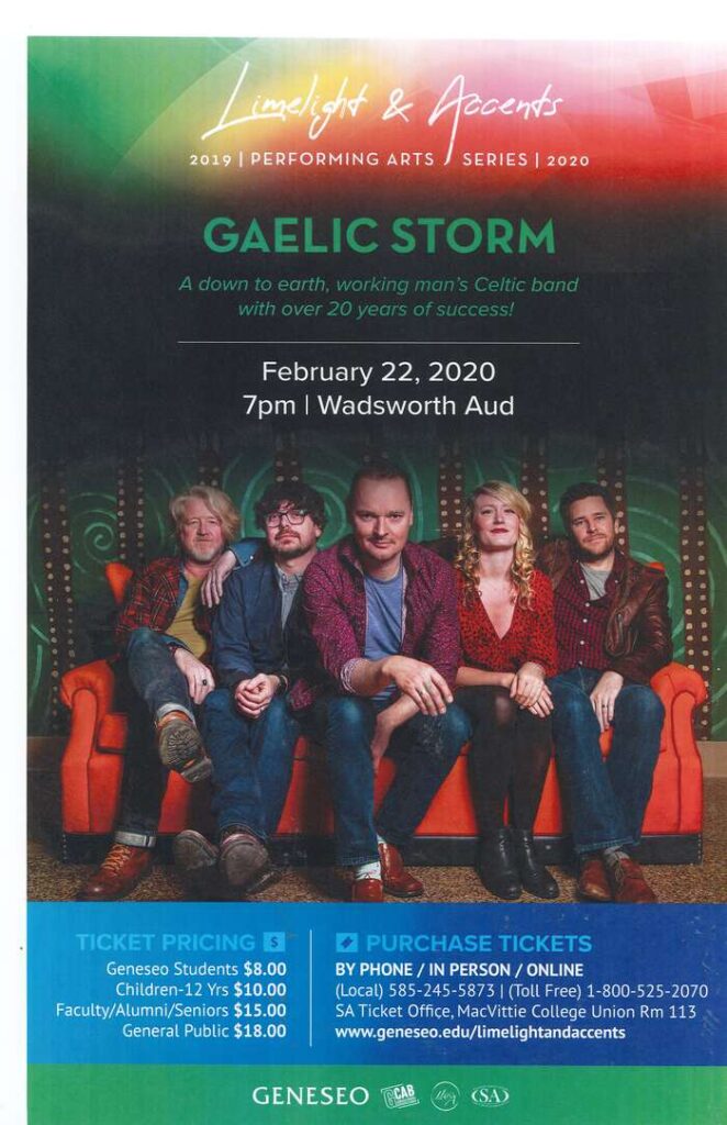 Finally, in late February of 2020, Gaelic Storm came to Geneseo to perform, again for the Limelight series in Wadsworth Auditorium. Gaelic Storm was formed in 1966 when band members Patrick Murphy, Steve Wehmeyer, Steve Twigger, Shep Lonsdale, Brian Walsh, and Samantha Hunt performed at O’Brien’s Irish Pub and Restaurant in Santa Monica, California, where Murphy was the manager. This led to a number of pub performances for the next year. In 1997, the band appeared in the film Titanic. This served to boost their popularity, leading to performances outside the US, including in places such as Japan, the UK, and France.