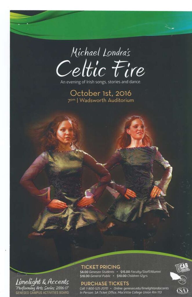 In early October of 2016, Emmy®-nominated Irish singer-producer Michael Londra performed his traditional tunes for Geneseo students, and was accompanied on the stage by the Celtic Fire dance group. Born in Wexford, Ireland, Londra moved to the United States as an adult after his musical career took off, where he was offered lead singer roles at venues such as Radio City Music Hall and Broadway. Londa’s big break in the U.S. was when he obtained the lead role in Broadway’s Riverdance. Londra currently resides in Ames, Iowa, though his most recent project is developing a PBS show Ireland with Michael, in which he leads viewers on tours across Ireland. The dance group Celtic Fire is composed of many world-class Irish dancers, performing for audiences jigs and reels choreographed by teacher and performer Claire Worley.