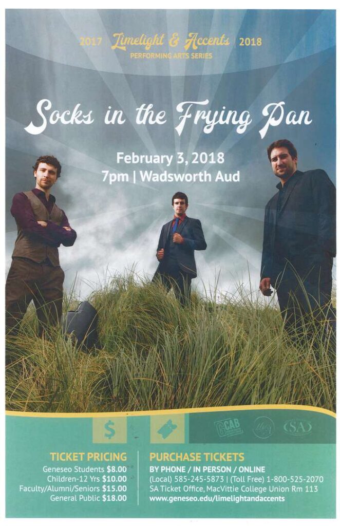 A little over a year later, in early February of 2018, Socks in the Frying Pan performed as another part of the Limelight series in Wadsworth Auditorium. Socks in the Frying Pan are a musical trio from County Clare on the West Coast of Ireland. The band is composed of Aodán Coyne on guitar and vocals, Shane Hayes on accordion, and Hayes’s brother Fiachra Hayes on fiddle and banjo. The trio performs traditional Irish music, mixed with their own personal flair, and have won multiple awards over the years. In the US, they’ve been booked to perform at every major Irish festival.