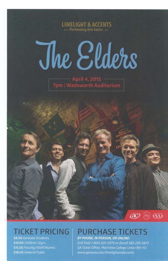 This affinity for Irish music persists to this day, and is evident in the numerous Irish or Irish-inspired bands that have performed at SUNY Geneseo over the last decade. In April of 2015, a six-person band called The Elders performed in the Wadsworth Auditorium as part of the campus’s Limelight performing arts series. Though the band was formed in Kansas in 1998, the frontman was born in County Wicklow in Ireland. Current members include frontman Ian Byrne, guitarist Steve Phillips, bassist Norm Dahlor, violinist & keyboardist Brent Hoad, drummer Kian Byrne (Ian Byrne’s son), and fiddler Colin Farrell. The band ceased live performances in 2018, and in 2020 guitarist Phillips passed away from complications due to COVID-19. The Elders performed traditional Irish music and were booked for festivals across the US, including in Philadelphia, New York City, Cleveland, Chicago, Milwaukee, Denver, and Dublin, Ohio. Not to be confused with Dublin, Ireland, though they have played there as well, in addition to other cities in Ireland and across Europe.